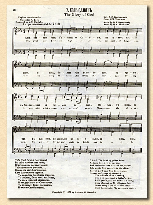 The poem "Kol Slaven" (How Glorious is Our Lord in Zion) was written by poet and playwright Mikhail Matveevich Kheraskov (1733-1807). The music for the hymn, based on folk and church melodies, was composed by Dmitry Stepanovich Bortnyanskiy (1751-1825).