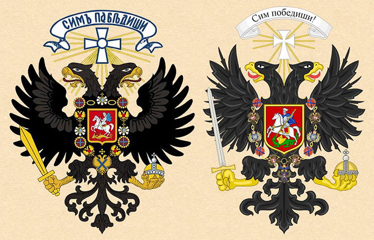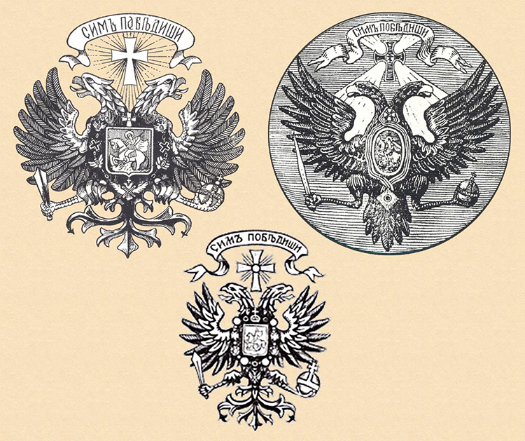 The traditional double-headed eagle was inherited as the coat of arms, from which the Provisional Government had removed the symbols of monarchical dignity (the crown and sceptre). Kolchak added the cross of St. Constantine with the motto "With this sign you shalt conquer" instead of the crowns, and placed a sword in the eagle's talons instead of the sceptre. The design of the eagle was also changed: unlike the pre-revolutionary eagle and its modern counterpart, which follows it exactly, the eagle was depicted not with outstretched wings, but with wings spread wide. For comparison, see the photographs of Kolchak at the end of this book: in one of them he is photographed in an admiral's uniform with eagles on his epaulettes before the revolution, and in another from during the Civil War.