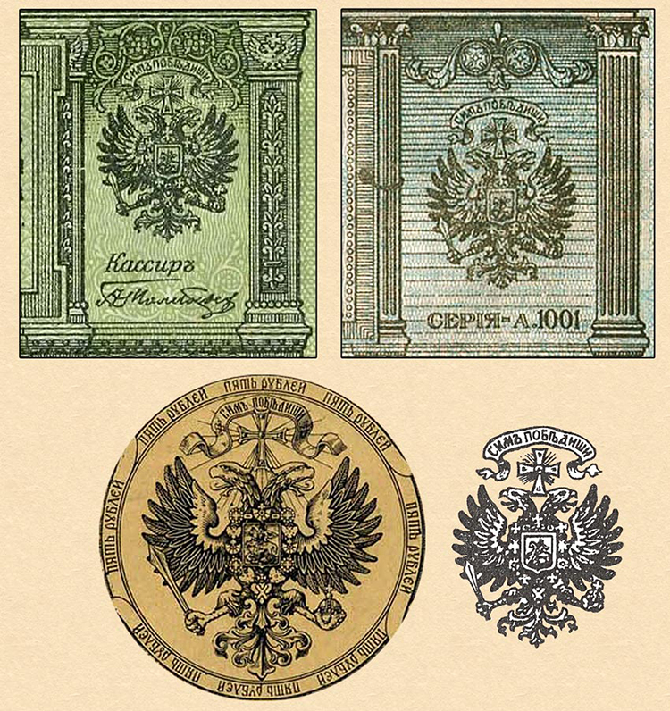 Above are the reverse sides of 250-, 50- and 5000-ruble treasury notes of the Government of the Russian Eastern Frontier (issued in 1920 on behalf of the Siberian Provisional Government). The sceptre in the eagle's left talon has been replaced by a sword, so that the eagle holds two swords in its talons.