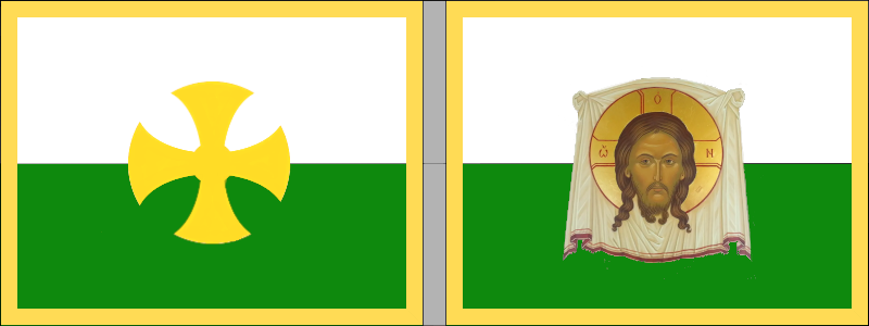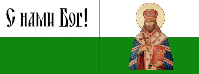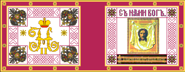 The Division's flag has not survived, but is known to be St. Innocent, patron saint of Siberia, on the front and the inscription "God is with us" on the reverse. It presumably looked something like this: