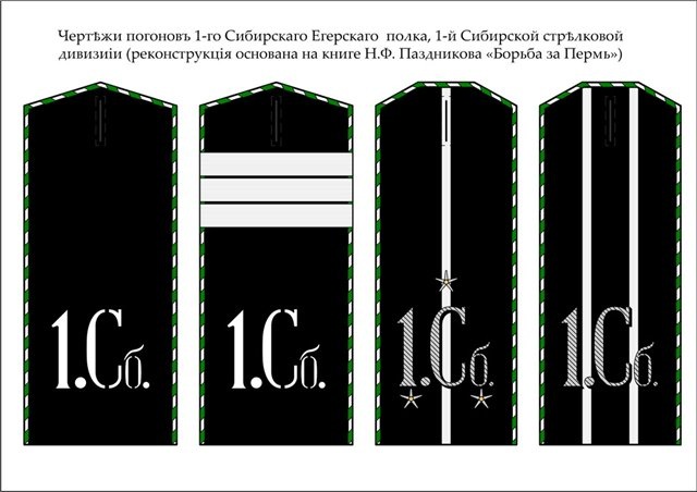The shoulder-boards of the 1st Siberian Jaeger Regiment were taken from a reconstruction by Perm researcher K. Novikov at www.bergenschild.narod.ru [link dead].