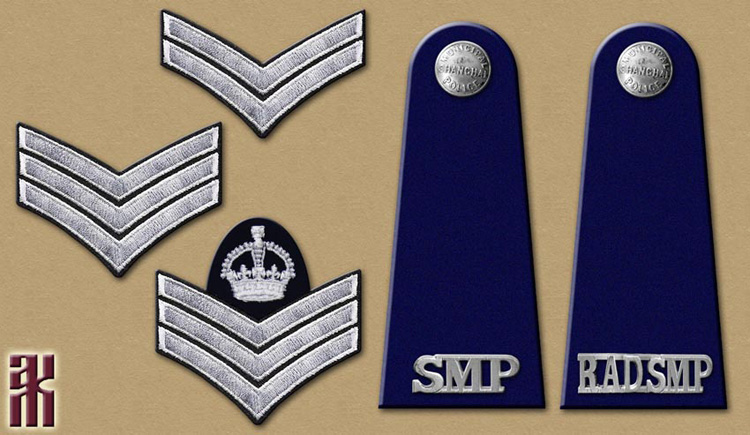 24 November 1940. In recognition of their services to the international settlement, the Municipal Council retained the ranks and external distinctions assigned to the officers of the regiment. ... On 15 January 1941, by order of the Shanghai Volunteer Corps, the regiment left the corps and was placed at the disposal of the chief of the municipal police. ... The next day, 16 January 1941, the regiment was renamed the "Russian Auxiliary Detachment of the Shanghai Municipal Police" ... Soon the unit received new "blue" police uniforms with silver lettering on the shoulder-boards reading "R.A.D.S.M.P." The officers were given police uniforms with the number of stars they had in the corps: the regimental commander received a uniform of a senior assistant chief of police, the captains received the uniform of assistant chiefs of police, and the lieutenants received the uniforms of police superintendents. The uniform was excellent, tailor-made from high-quality material. The officers' peaked caps, trimmed with wide silver braid (according to rank), were adorned with a large, solid silver enamel star with the coat of arms of a military model. The short lacquered stick was replaced by a police baton of the standard police model, which served as their "cold weapon".