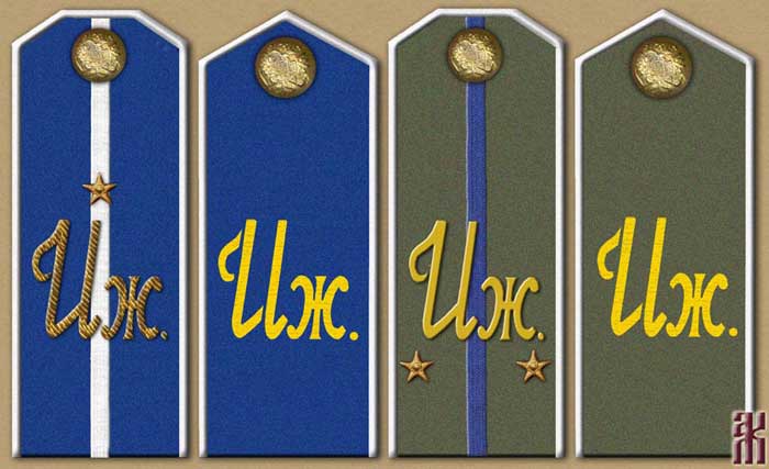 For officers: the same model as for soldiers, but with narrow (½ cm) silver braid, sewn in a zigzag pattern for generals, and the appropriate number of lengthways stripes down the shoulder-board for staff and senior officers (one or two) and with the corresponding number of gilded stars for each rank. Unit numbers and distinctive insignia for different branches of the military are made of white metal, gilded in the artillery.