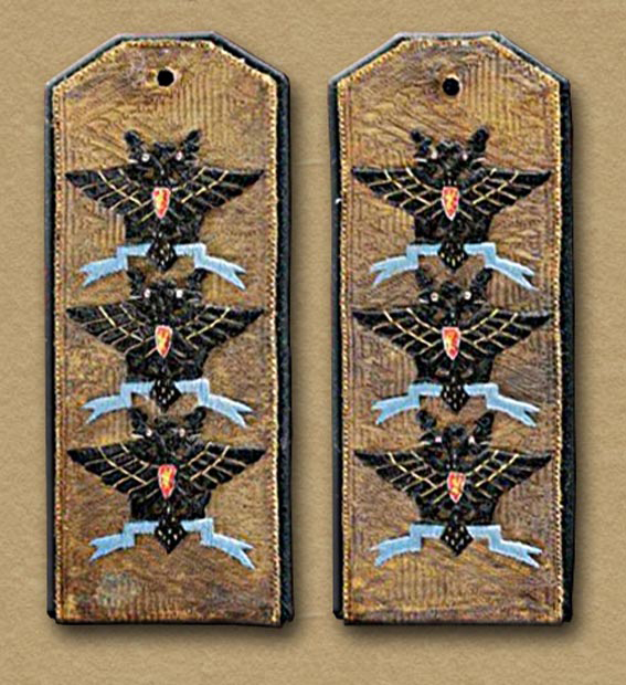 Those shoulder-boards were hexagonal in shape, with a gold braid field of a standard pattern. They were lined with black cloth and had buttons bearing the image of the Admiralty anchor. The unusual pattern of double-headed eagles with outstretched wings, devoid of their former state attributes (crown, sceptre and orb) and superimposed on two crossed Admiralty anchors, attracts attention. On the chest of the eagles, perched on a blue St. Andrew's ribbon, there was a shield with a red field and gold piping, embroidered with the image of St. George the Victorious. The embroidery was done with black cotton thread, and the details of the plumage were worked in gold metal thread.