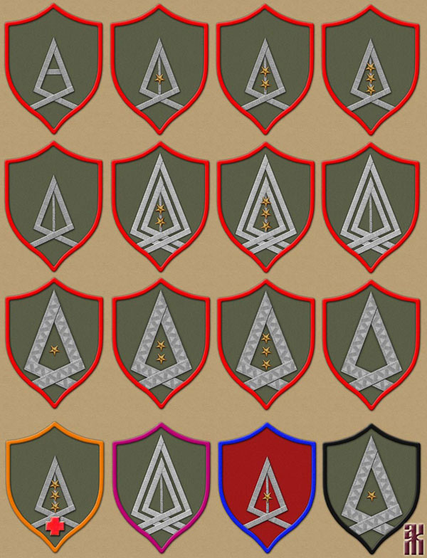 The shield is the same colour as the blouse. The piping for aviation specialists is red, and for other military personnel it is black.