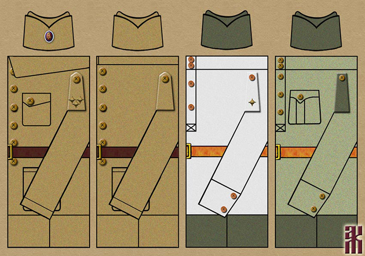 The reconstructions are based on a photograph taken in May 1919 during a review of the unit by the Supreme Ruler. Figure 1 shows a jacket of arbitrary design with Russian shoulder-boards. Figures 2 and 3 show British other ranks uniforms (the officer is distinguished from the lance-corporal by his leather equipment, sword belt, shoulder-boards and cap with coloured piping). Figure 4 shows a winter coat, which was rolled up in the photograph.