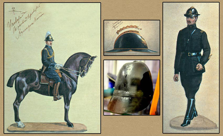 For mounted police officers. The same uniform as for foot, but the piping and braid around the sleeves of the tunic and coat, as well as the piping on the trousers, were white. The shoulder-boards had white stripes. The hair crest on the helmet and aiguilettes were white.