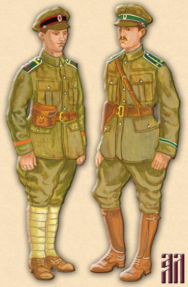 3 and 4 – Russian uniform variants with distinctions established for Siberian Rifle Divisions (as existed in the 11th Siberian Rifle Division).