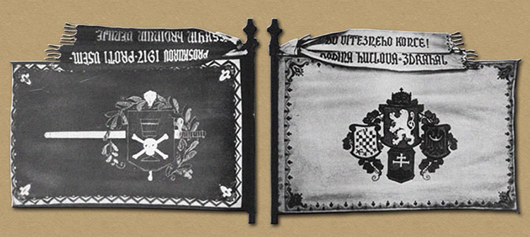 Here for the first time we see the combination of the Hussite chalice and the coat of arms of Bohemia in the form of a silver Lion, which became almost universal for the Czechoslovak units in Russia. The jagged edging of the cloth was inherited from the regimental banners of the Austro-Hungarian army (except using white-red of Czechoslovakia with rather than the German black-red-yellow).