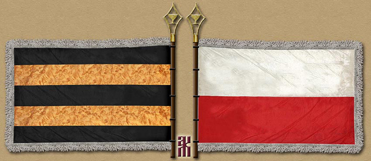 The shape of the standard was inherited from the old cavalry regiments of the Austro-Hungarian Army (they were this shape until the introduction of rectangular standards of the 1859 model, and then from 1862 onwards they were abolished altogether, except for the 14th Dragoon Regiment, which distinguished itself during the Austro-Prussian War). The front has an embroidered monogram intertwining a "J", "I" and "B" (for Jan Iskra of Brandis).