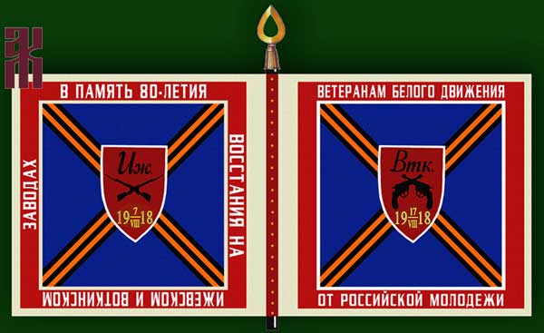 It is a rectangular blue double-sided banner with a wide square red border and a narrow inner white frame. Inside that, the front has a diagonal cross made of St. George ribbon, with a red shield with the capital letters "VTK", an emblem of crossed revolvers, and the date "17.VIII.1918". The border has the inscription "To the veterans of the White movement, from the youth of Russia". The reverse has a diagonal cross made of St. George ribbon, with a red shield with the capital letters "IZH", an emblem of crossed rifles and the date "7.VIII.1918". The inscription in the border reads: "In memory of the 80th Anniversary of the uprising at the Izhevsk and Votkinsk factories" The dates are embroidered with gold thread, and the inscriptions on the frame are laid out with silver braid.