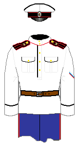 Deryabin in the text states that the hat is piped red, but his picture shows black, which the usual pattern (cap piping being shoulder-board field colour).