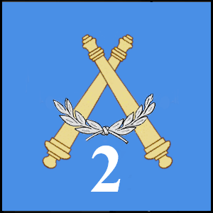 This flag is based on the known badge for the Alekseev artillery (silver wreath over gold cannons to form an "A"), very similar to the infantry flag, with a number for the battery. The field colour is based on the infantry colour.