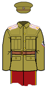 Apparently it had a white cap, piped red, with a red band (presumably piped white). Shoulder-boards were red, piped white. Trousers were blue with a white stripe.