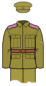The shoulder-boards were raspberry with white piping and silver lace, with a gold letter "D" for officers, while the lower ranks had raspberry with black piping and a copper letter "D". However, many officers wore their old shoulder-boards and its doubtful the rankers had the metal letters. The "D" was not the Imperial version, but an older ornate version, the same as the infantry (many sites show it open at the top which would have been impractical to cast).