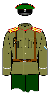 The dress uniform officers of the 1st Brigade is shown above. The cap was dark green, piped red, with a black hatband, piped red. Cuffs were piped white. Trousers were green, striped in red.