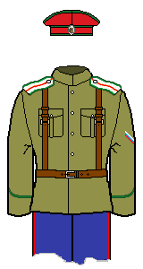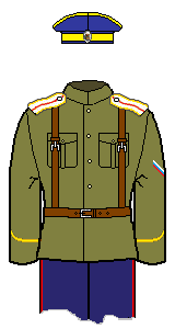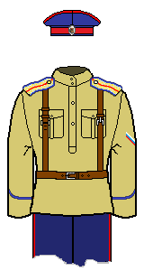 There are some disputes among my sources as to the exact colours of the cuff piping: I have gone with the normal scheme (matching to shoulder-board piping) in such instances. The other ranks (not officers) of the two Hussar units may have had dark green cuff piping. Note the cuff piping was not flat, but peaked.