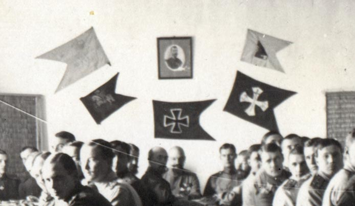 An interesting photo has survived from very early in the emigration period of former guards at a dinner. On the wall are what would seem to be battalion and company flags. These had no system, so any relevent imagery would be suitable.