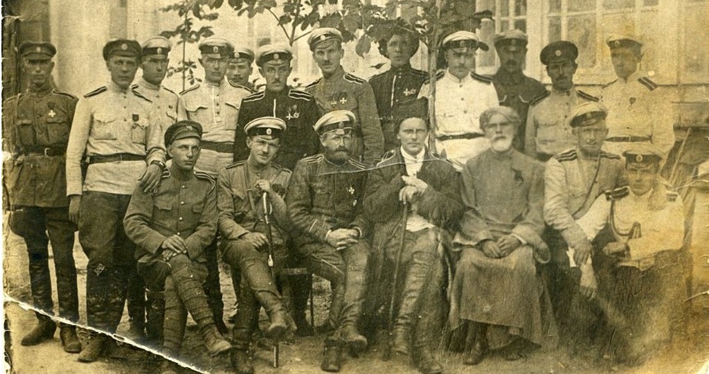 The photo above (from Wikipedia) is of long-time Markovtsy officers (and priest). It is the one I have found with the most dress hats, by quite some margin. Notice there is only one man in black and the variable or missing piping on the hats and tunics/blouses (I think only two or three of the tunics here are actually white, the others are just very faded khaki). The shoulder-boards are all Markov black, but are not monogrammed.