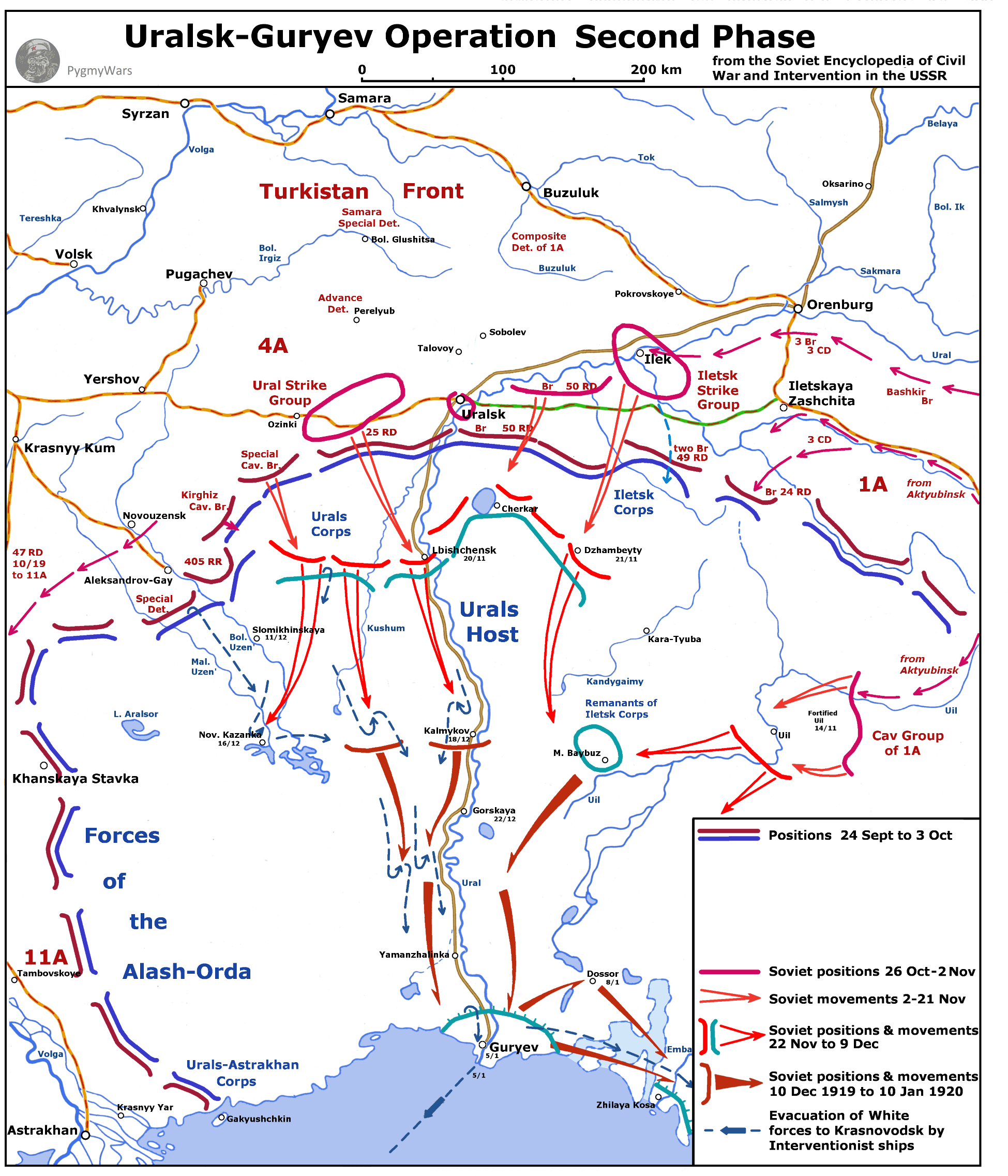 In September 1919 the Orenburg Cossacks were defeated, and what remained of their forces were retiring, mostly eastwards. This left the Urals Cossacks and the western branch of the anti-Bolshevik Kazakhs (Alash-Orda) cut off from the other White forces. The Soviets decided to concentrate their forces to defeat them.