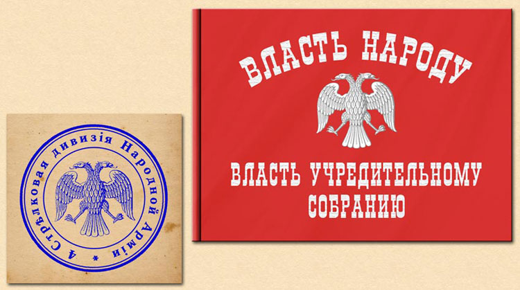 Examples of the use of the coat of arms by KOMUCH: the seal of the HQ of the 4th Rifle (Ufa) Division of the People's Army and one of the first flags ordered by KOMUCH for presentation to units of the People's Army.