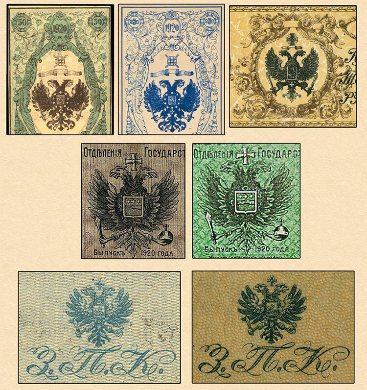 Above are the reverse sides of 250-, 50- and 5000-ruble treasury notes of the Government of the Russian Eastern Frontier (issued in 1920 on behalf of the Siberian Provisional Government). The sceptre in the eagle's left talon has been replaced by a sword, so that the eagle holds two swords in its talons.