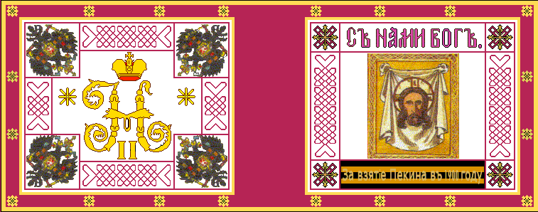 The Division's flag has not survived, but is known to be St. Innocent, patron saint of Siberia, on the front and the inscription "God is with us" on the reverse. It presumably looked something like this: