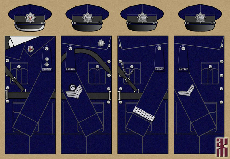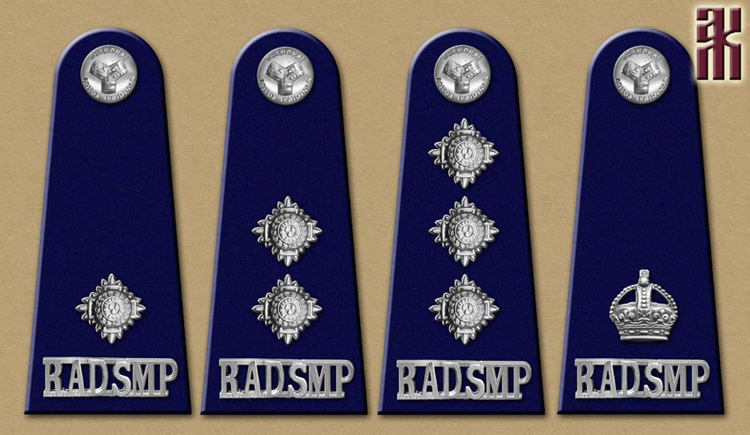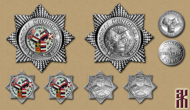 24 November 1940. In recognition of their services to the international settlement, the Municipal Council retained the ranks and external distinctions assigned to the officers of the regiment. ... On 15 January 1941, by order of the Shanghai Volunteer Corps, the regiment left the corps and was placed at the disposal of the chief of the municipal police. ... The next day, 16 January 1941, the regiment was renamed the "Russian Auxiliary Detachment of the Shanghai Municipal Police" ... Soon the unit received new "blue" police uniforms with silver lettering on the shoulder-boards reading "R.A.D.S.M.P." The officers were given police uniforms with the number of stars they had in the corps: the regimental commander received a uniform of a senior assistant chief of police, the captains received the uniform of assistant chiefs of police, and the lieutenants received the uniforms of police superintendents. The uniform was excellent, tailor-made from high-quality material. The officers' peaked caps, trimmed with wide silver braid (according to rank), were adorned with a large, solid silver enamel star with the coat of arms of a military model. The short lacquered stick was replaced by a police baton of the standard police model, which served as their "cold weapon".