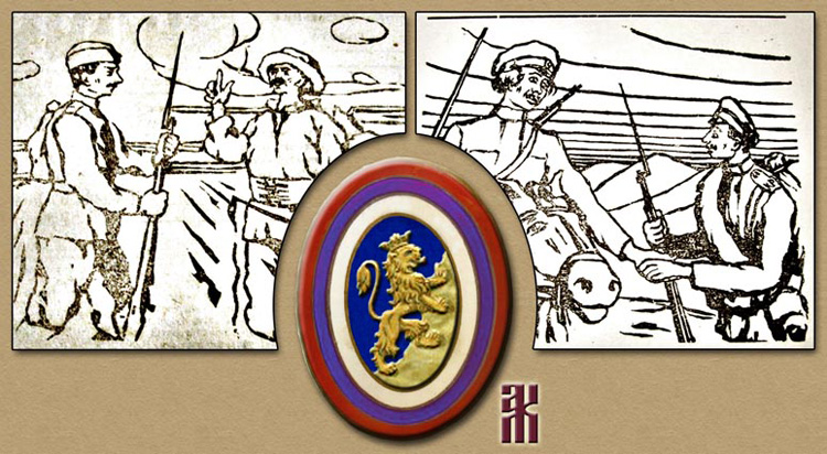 The cockades worn by our soldiers on their caps depict our Galician-Russian coat of arms, i.e. a yellow lion on a blue field, climbing a rock. The coat of arms is bordered by a Russian national ribbon as a sign that our homeland is united with the entire Russian people.