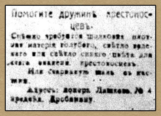 An advertisement in the newspaper Russkaya Rech dated 17 September 1919 requesting assistance in sewing a banner of the Order of the Holy Cross