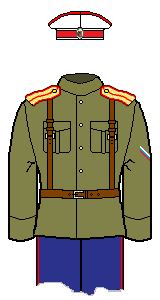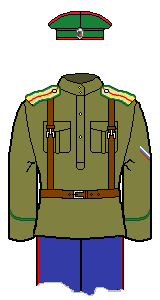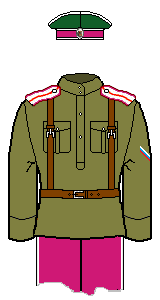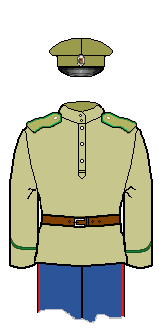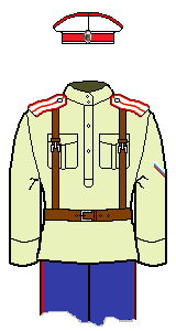 There are some disputes among my sources as to the exact colours of the cuff piping: I have gone with the normal scheme (matching to shoulder-board piping) in such instances. The other ranks (not officers) of the two Hussar units may have had dark green cuff piping. Note the cuff piping was not flat, but peaked.