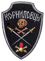 | Officer: General Kornilov Artillery Brigade | Portrait of V. M. Maksimov in what appears to be the uniform of the Kornilov Engineer Company | Artillery sleeve badge |