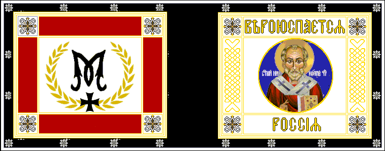 The flags are sourced from the pictures in Pavlov's history of the Markovtsy. He shows them as quite close to square. The 1st Regiment was a simple white St Andrews cross on black