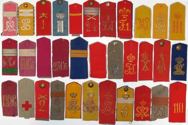 Officers were meant to wear coloured shoulder-boards at all times, though WWI field versions were often considerably less ornate and colourful, sometimes little more than light cloth with markings sewn or pencilled on.